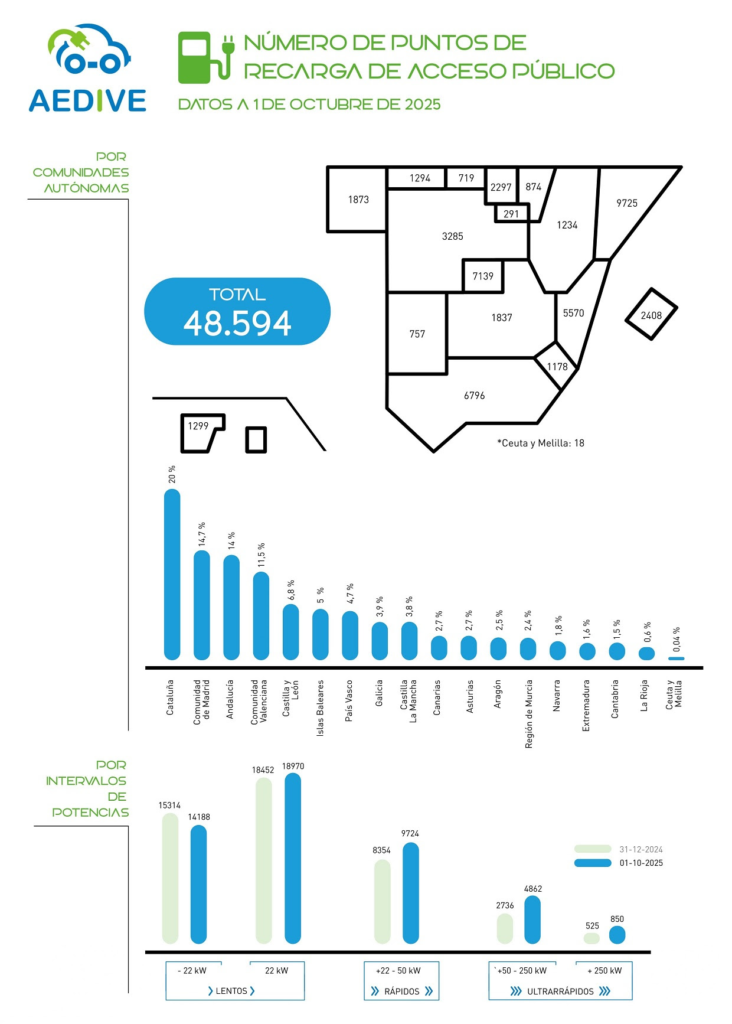 La red de infraestructuras de recarga de acceso público en España alcanza un total de 48.594 puntos operativos a fecha de 1 de octubre de 2025, según los datos de AEDIVE (Asociación Empresarial para el Desarrollo e Impulso de la Movilidad Eléctrica) recogidos del conjunto de operadores (CPOs) nacionales de recarga, cifra que supone un crecimiento del 7,08 % en comparación con el volumen del 31 de diciembre de 2024.