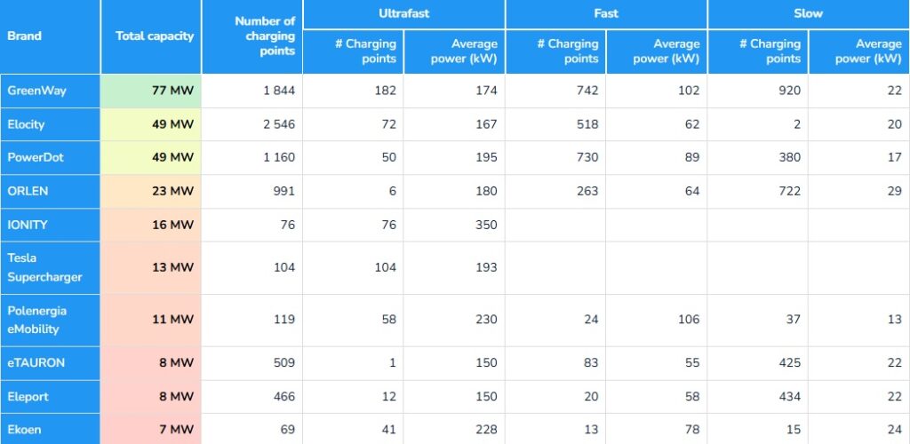In fourth place is Polenergia eMobility, with 58 ultra-rapid devices (approximately 49.15%) out of a total of 118. This CPO also has 24 fast chargers and 37 slow chargers.