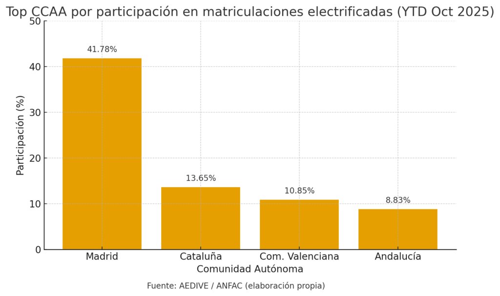 - CCAA con más peso YTD en electrificados: Madrid 41,78%; Cataluña 13,65%; C. Valenciana 10,85%; Andalucía 8,83%.